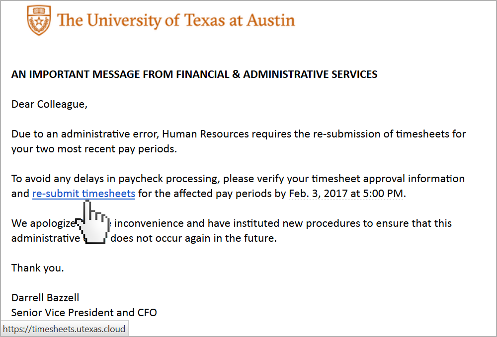- Hovering over the link (or tapping-and-holding on a mobile device) reveals that the “re-submit timesheets” link points to a site in the utexas.cloud domain, which is not part of the University’s official utexas.edu website.