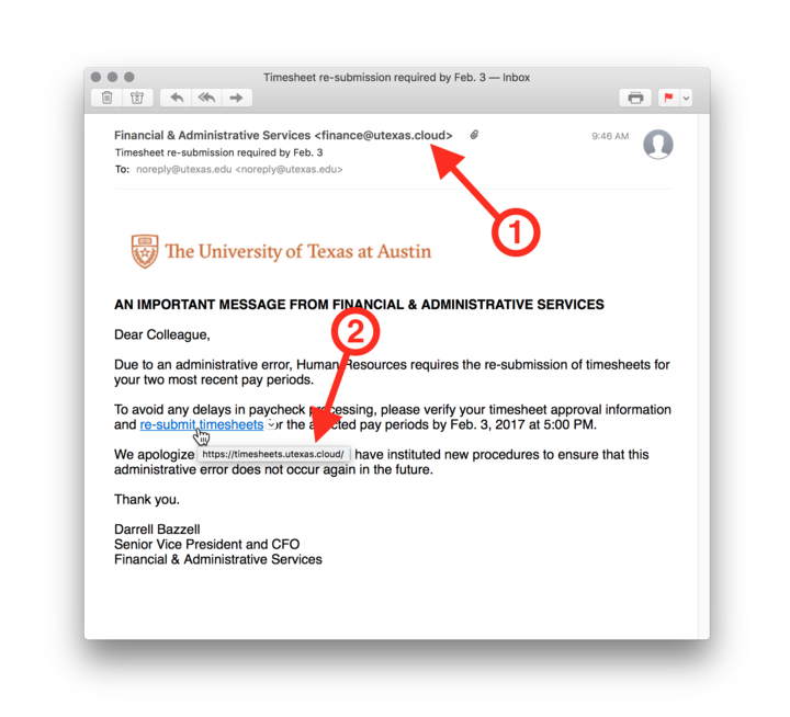 - Though the sender’s name is “Financial & Administrative Services”, an actual campus organization, the sender’s address (finance@utexas.cloud) is not an official University account.